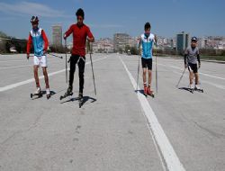 Büyükşehir Belediyesi Spor Kulübü Tekerlekli Kayak Takımı sporcuları, Haziran’da yapılacak Türkiye Şampiyonası’na Atatürk Kültür Merkezi’ndeki tören alanında hazırlanıyor. Ellerindeki demir batonlar ve ayaklarındaki tekerlekli kayaklarla, asfalt üzerinde hızlanan sporcuların hedefi ise Ankara ’ya zafer ile dönmek. Vatandaşların şaşkın bakışları arasında sürdürdükleri antremanlar ve tekerlekli kayak ile ilgi veren takım antrenörü, Dünya Tekerlekli Kayak eski şampiyonu Fatih Yüksel, “Son 10-15 yılda ortaya çıkan bir spor. Önceleri kayak sporu sadece kış aylarında yapılabiliyordu. Tekerlekli kayak sayesinde yılın her dönemine yayıldı. Aralarındaki fark ise kar yerine asfaltta kayılıyor olması. Koşu ve antremanlarımızı, geniş bir alan olduğu için Atatürk Kültür Merkezi’nde yapıyoruz. Kış aylarında da Elmadağ’da tırmanış ve dağ koşusuna çıkıyoruz” diye konuştu.